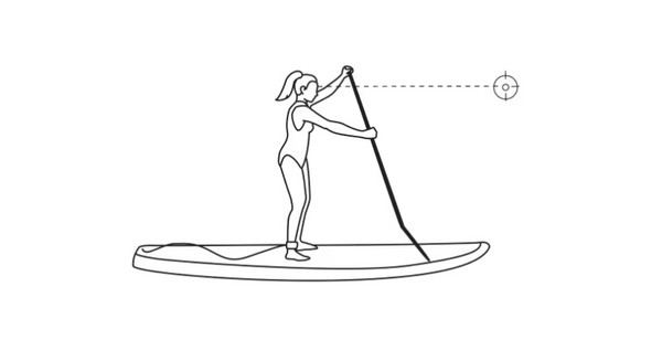 Pulling: The paddle board extends into the water and slides along one side of the paddle board. The arms should be straight and form a triangle with the paddle board.