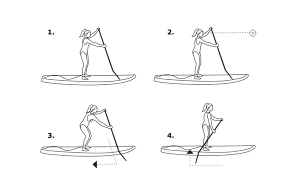 From left to right, we first extend the paddle, second make sure the face is facing straight ahead, third grab the water and slide, and fourth lift.