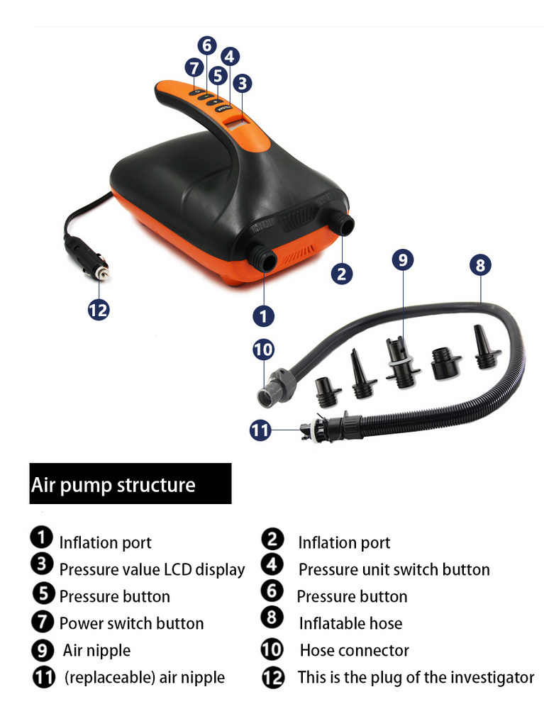 This electric pump is suitable for use with surfboards/paddleboards, as well as most inflatable products. Mainly include: inflatable paddle boards, assault boats, rubber boats, air mattresses, pools, air cushion sofas, inflatable tents, etc.